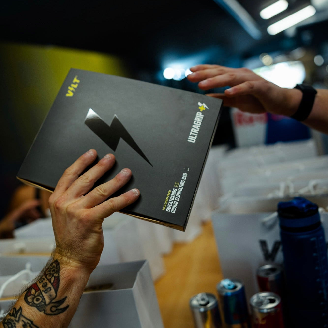 1 pair of UltraGrip+ V2 and free train.VOLT sweatbands included.